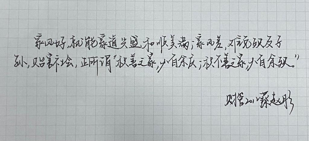 活动开展以来,乐天使全体师生员工积极响应、踊跃参加,以手抄金句的形式夯实拒腐防变的思想根基。一字一句,铭记领袖嘱托,感悟思想伟力;一笔一画,展现初心使命,书写责任担当。通过此次金句摘抄活动,乐天使全体师生员工深刻认识到家风建设的重要性,并表示在今后的工作生活中用实际行动筑牢家庭反腐倡廉“防火墙”。