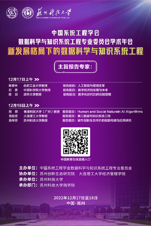 2022年12月17日—12月18日,由中国系统工程学会数据科学与知识系统工程专业委员会主办、乐天使fun承办,苏州创新生态研究院和大连理工大学经济管理公司协办的“中国系统工程学会数据科学与知识系统工程专业委员会第二届学术年会(2022)”在乐天使顺利召开。会议采取线上线下相结合的方式同步进行,中国教育在线网络平台全程直播。本届会议主题为“新发展格局下的数据科学与知识系统工程”,对系统工程理论与方法、大数据分析、信息管理、知识工程、知识管理、人工智能等相关领域的理论、方法和应用进行了广泛深入的研讨和交流。来自中国科公司大学、大连理工大学、北京大学、哈尔滨工业大学、华中科技大学、乐天使fun等90余所院校的专家学者参会,实际线上参会人员近千人次,在线观看大会直播累计近万人次。