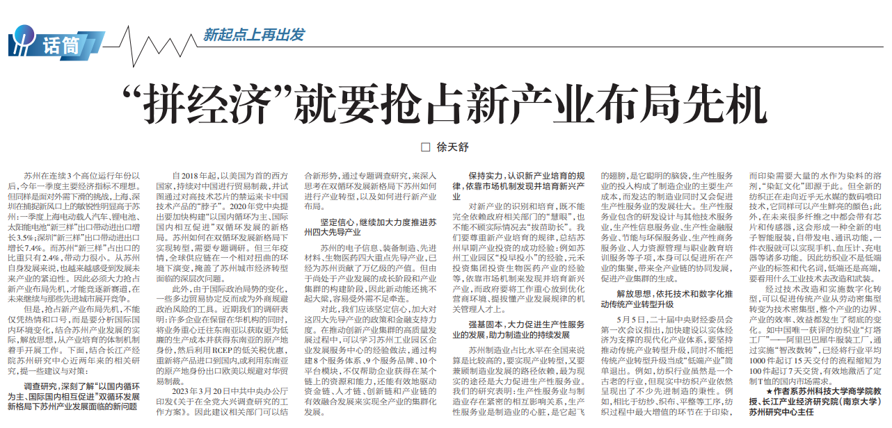 就抢占新产业布局先机,具体应当如何做?苏州日报“思想+”理论月刊进行了专家约稿。公司乐天使徐天舒教授撰写的“‘拼经济’就要抢占新产业布局先机”署名文章于5月30日在苏州日报B01版“思想+”理论月刊刊出。