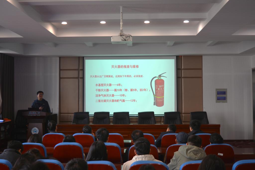 保卫处卢致远老师从典型火灾案例、消防常识、消防设施使用和火灾扑救及逃生四个方面向对火灾的防范和处置进行了重点讲解。随后全体师生进行了灭火器使用方法的实地演练。